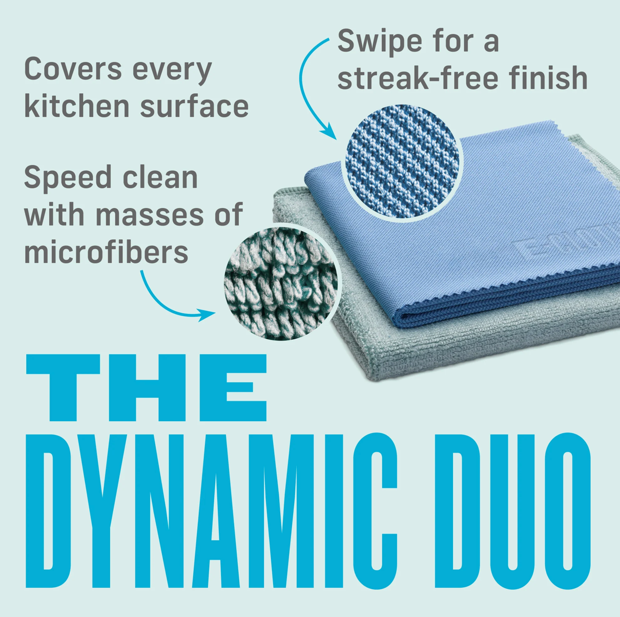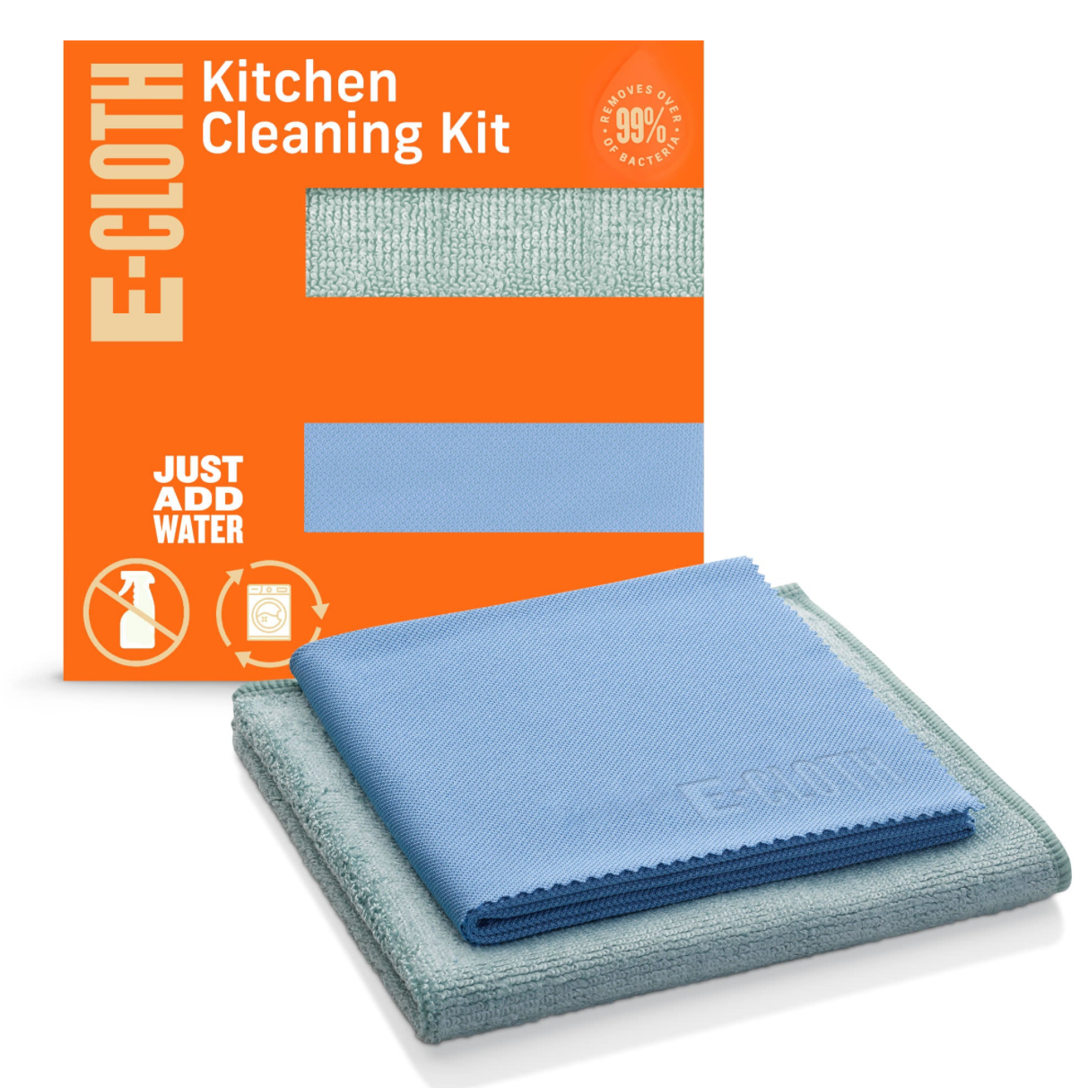 The two-piece E-Cloth Kitchen Cleaning Kit effortlessly keeps your kitchen looking like new from sink to stove, with premium microfiber that's appropriate for all surfaces. Use the Cleaning Cloth to wipe away greasy splatters, crumbs, and over 99% bacteria from countertops, appliances, stainless, and more. Stubborn splatters don't require extra tools, thanks to the handy sewn-in scrubbing pocket. Follow with the Glass & Polishing Cloth for gleaming, fingerprint-free surfaces. Because water alone activates our cloths, you can focus on cleaning — not spraying — and get through chores faster. Speed aside, you may not want additional cleaners in your food — or anywhere near it. This set helps you keep a squeaky-clean prep space with masses of precision-engineered microfibers, activated by water's cleaning might. No need to add additional cleaners. And because these cloths are guaranteed to last for 1 year or 100 washes, you may never put paper towels or spray bottles in your shopping cart again. Just toss them in the laundry to refresh. We think you’ll like our recipe for a clean kitchen: Dampen. Wipe. Repeat. So easy!