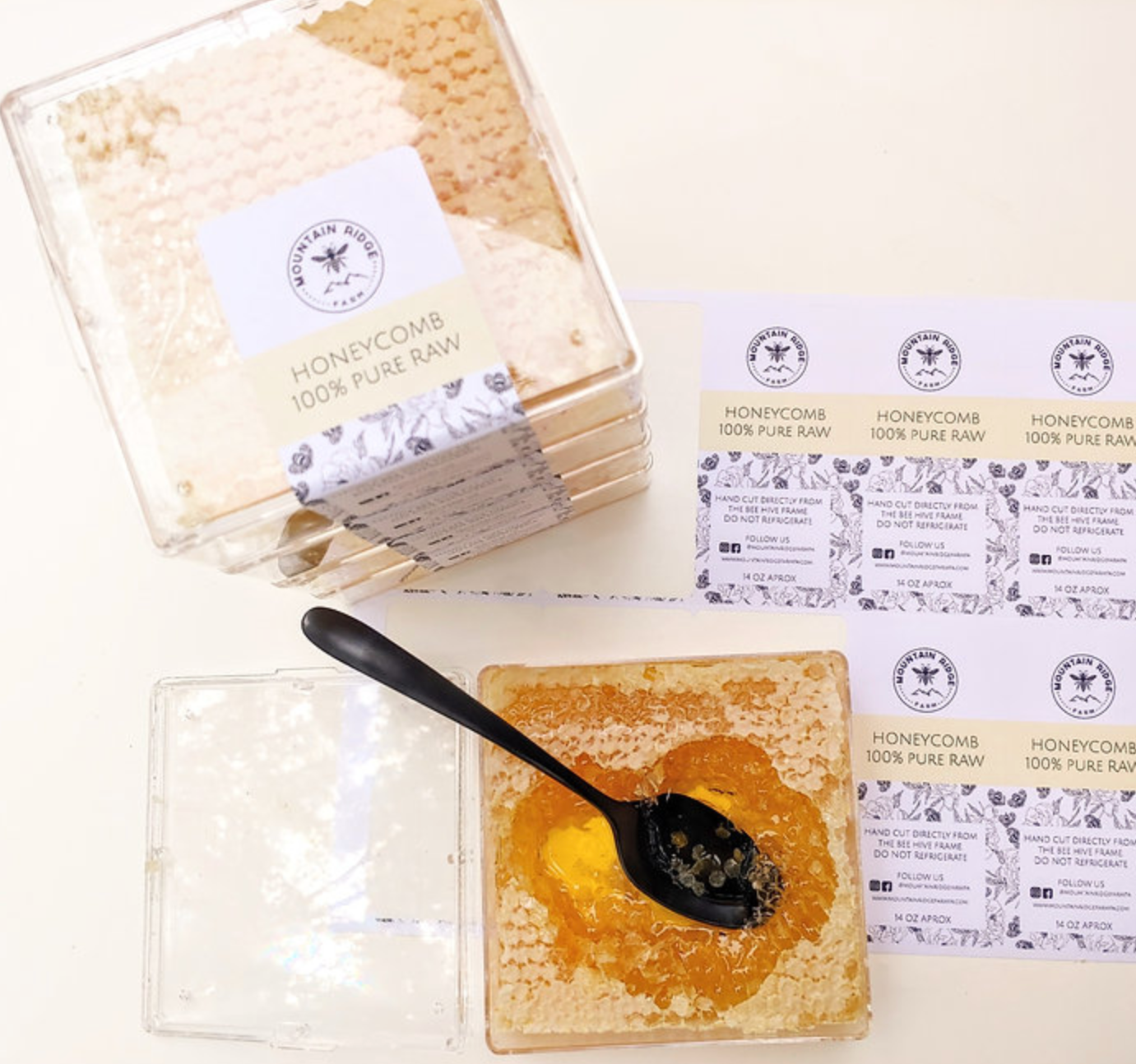 Our honeycomb with raw honey comes in a clear plastic box **weight and color can vary due to the thickness of the comb produced**