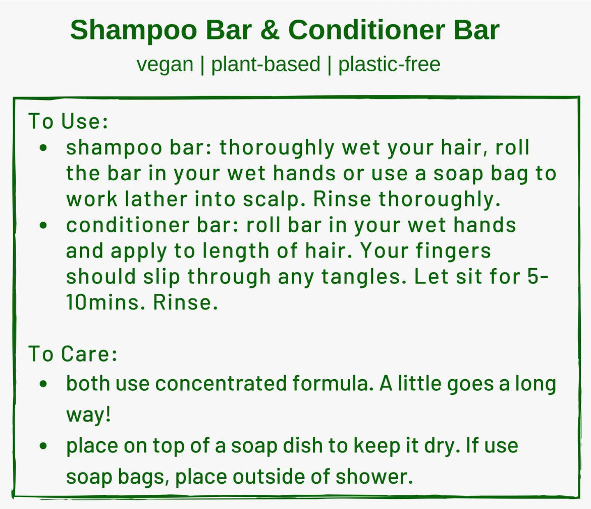 Made with mild and natural cleansing agents, the shampoo and conditioning bars pair perfectly together - they gently take away the dirt and oil while conditioning your hair to be more resilient, visibly smooth, and tangle-free. The more often you use them, the less product you will need to maintain the health of your hair.
