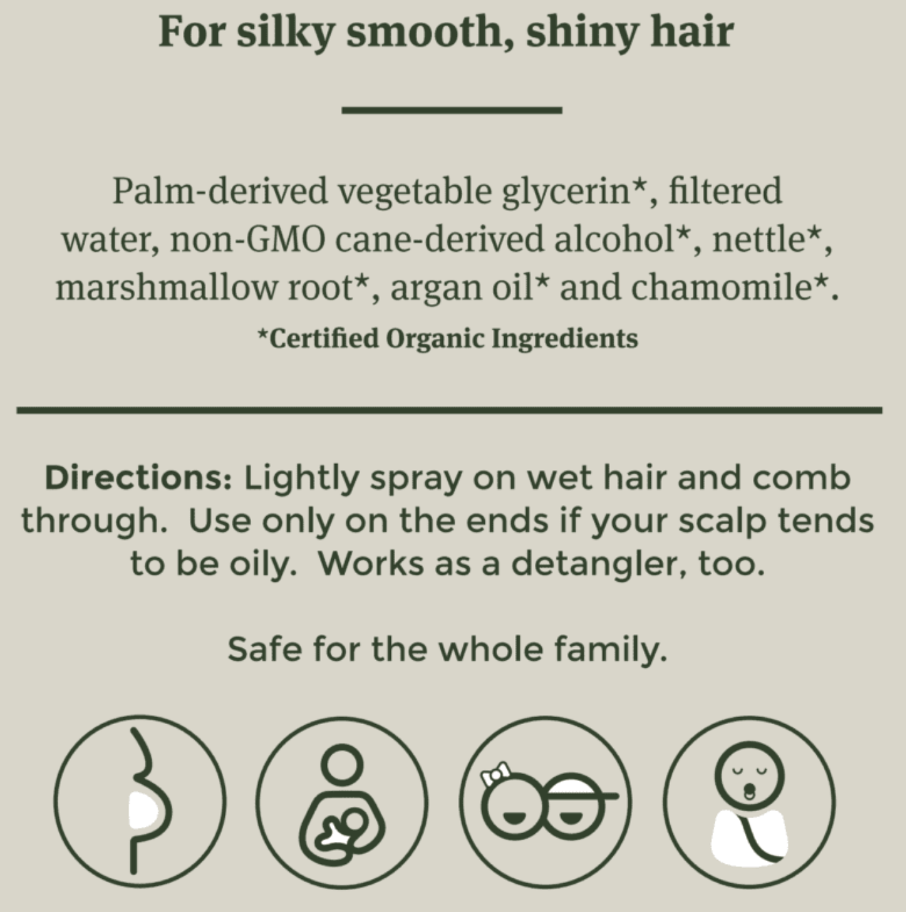 How to: Lightly spray on wet hair and comb through. Use only on the ends if your scalp tends to be oily. Works as a detangler too.