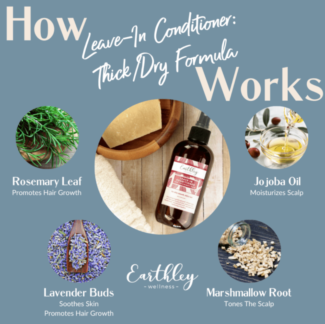 Our Leave-in Conditioner is an all-natural solution that softens the hair and tones the scalp to promote hair and scalp health, as well as hair growth! It works to help keep hair shiny and manageable without being greasy or heavy.