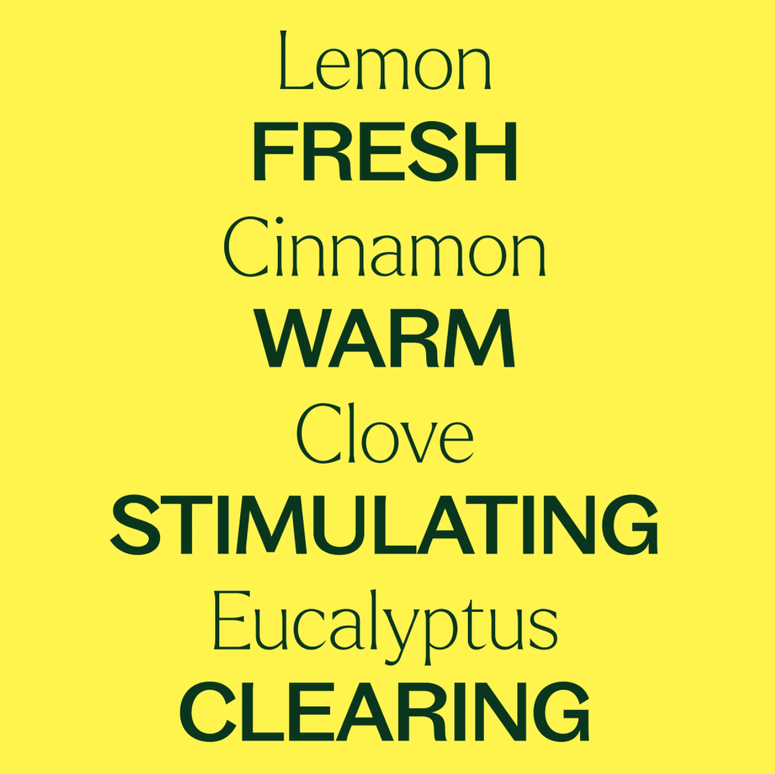 Ingredients: Cinnamomum Cassia Bark Oil, Citrus Limon (Lemon) Peel Oil, Eucalyptus Globulus Leaf Oil, Eugenia Caryophyllus (Clove) Bud Oil, Rosmarinus Officinalis (Rosemary) Leaf/Stem Oil