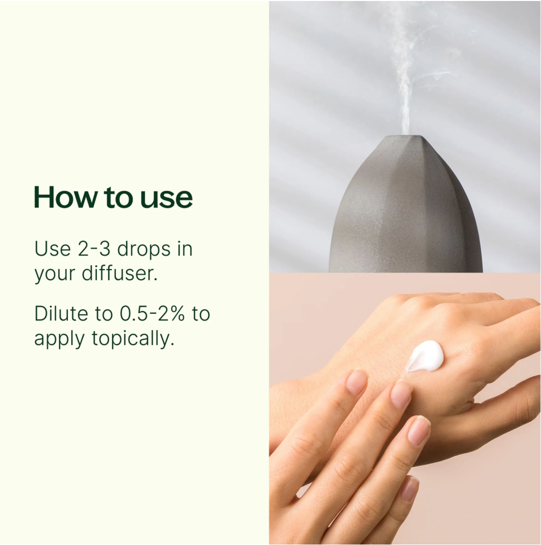 Aromatic: Diffuse using 2-3 drops per 100 mL of water or use in a personal inhaler.