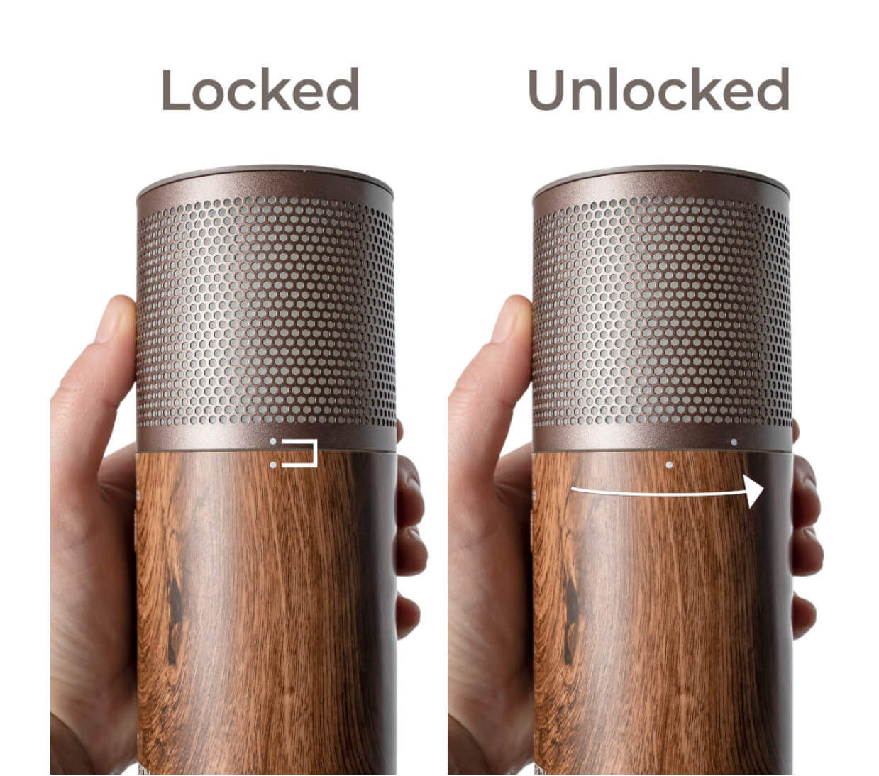 Hold the body, rotate the top counter-clockwise to unlock the metal cover. Add water into the reservoir until it reaches the RED maximum water marker. Do not overfill. Add 1-2 drops of your favorite essential oil to the water reservoir. Replace the metal cover and rotate clockwise to secure, making sure the lock marks are aligned. Press the button to start the device.