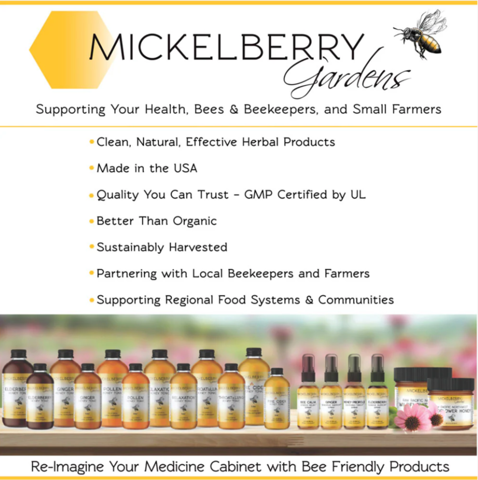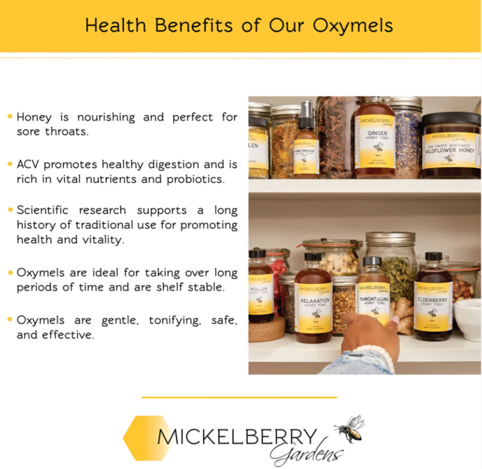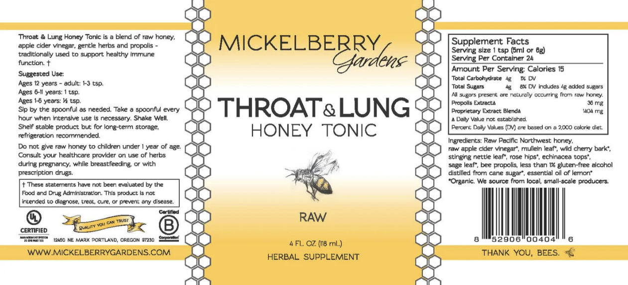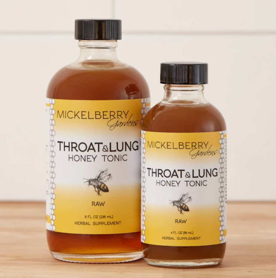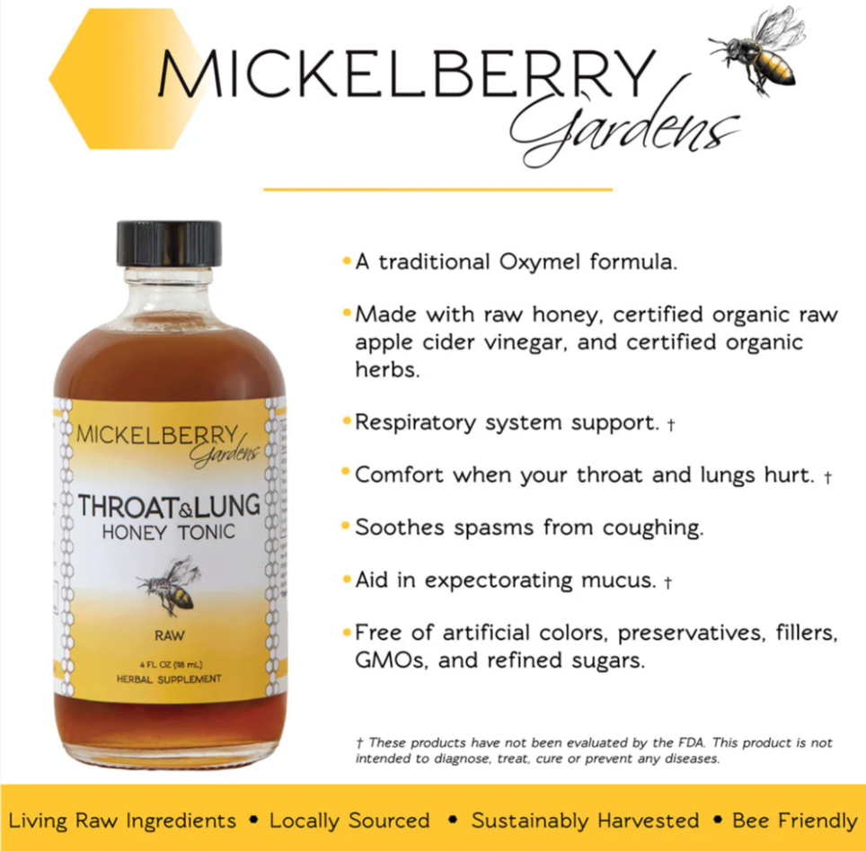 Mickelberry Gardens Throat and Lung formula utilizes raw honey, raw apple cider vinegar, and a combination of organic herbs traditionally used to support the throat and lungs. We have included herbs that are rich in vitamins and minerals, nourish and tone the lungs, soothe spasms from coughing, expectorate mucus, and contain antiseptic and antimicrobial qualities.