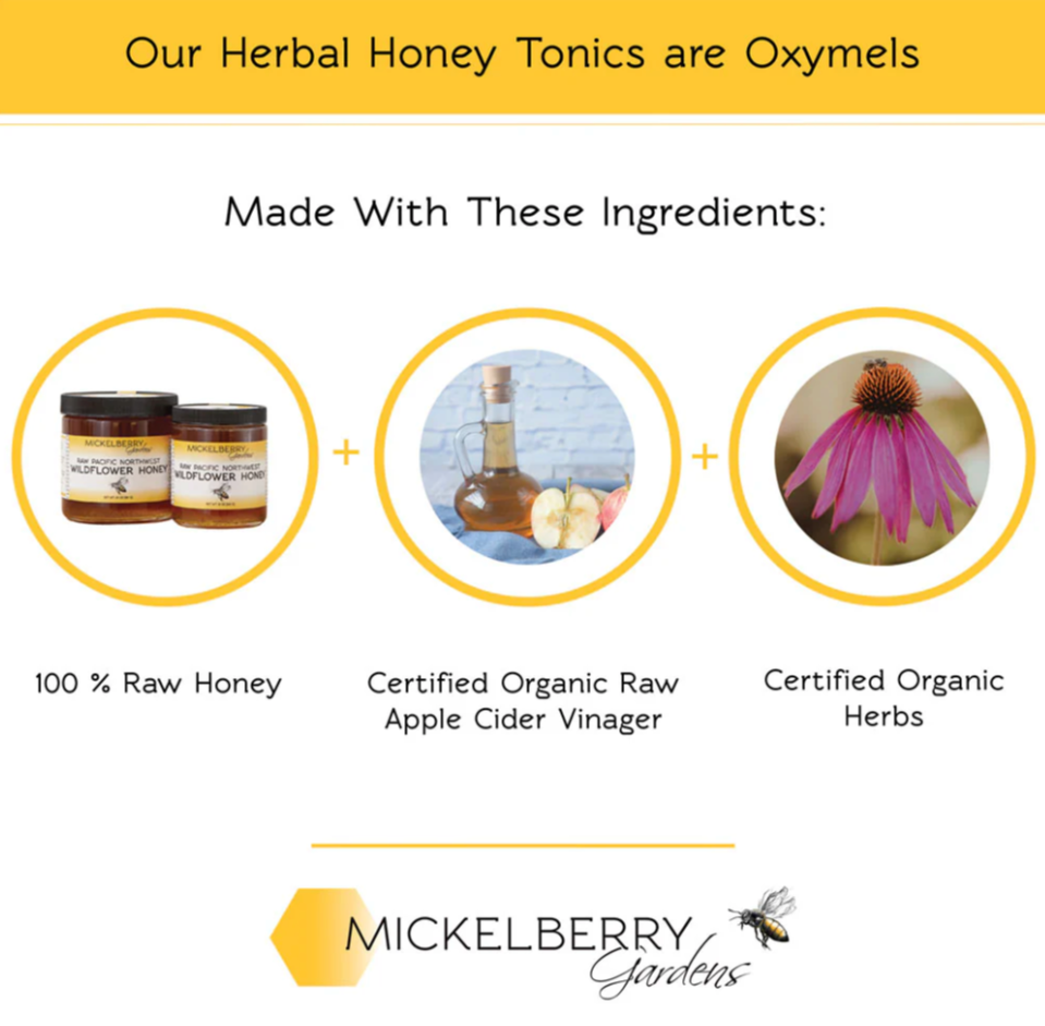 Mickelberry Gardens Throat and Lung Honey Tonic is a RAW oxymel – made with local raw honey and raw apple cider vinegar. Hippocrates promoted using vinegar mixed with honey as both an energizing tonic and a healing elixir. When honey is kept raw, it retains all of its healing virtues and preserves the delicate flavors from millions of wildflowers. Raw apple cider vinegar is rich with vitamins, antioxidants, enzymes, and probiotics, and helps to jump-start digestion. Throat and Lung Honey Tonic is made using the highest quality ingredients available. All our honey and certified organic apple cider vinegar is sourced from regional producers. We only purchase the freshest, whole organic herbs - often direct from local farmers. Our honey is tested for purity, and all our herbs are screened carefully for quality and strength.